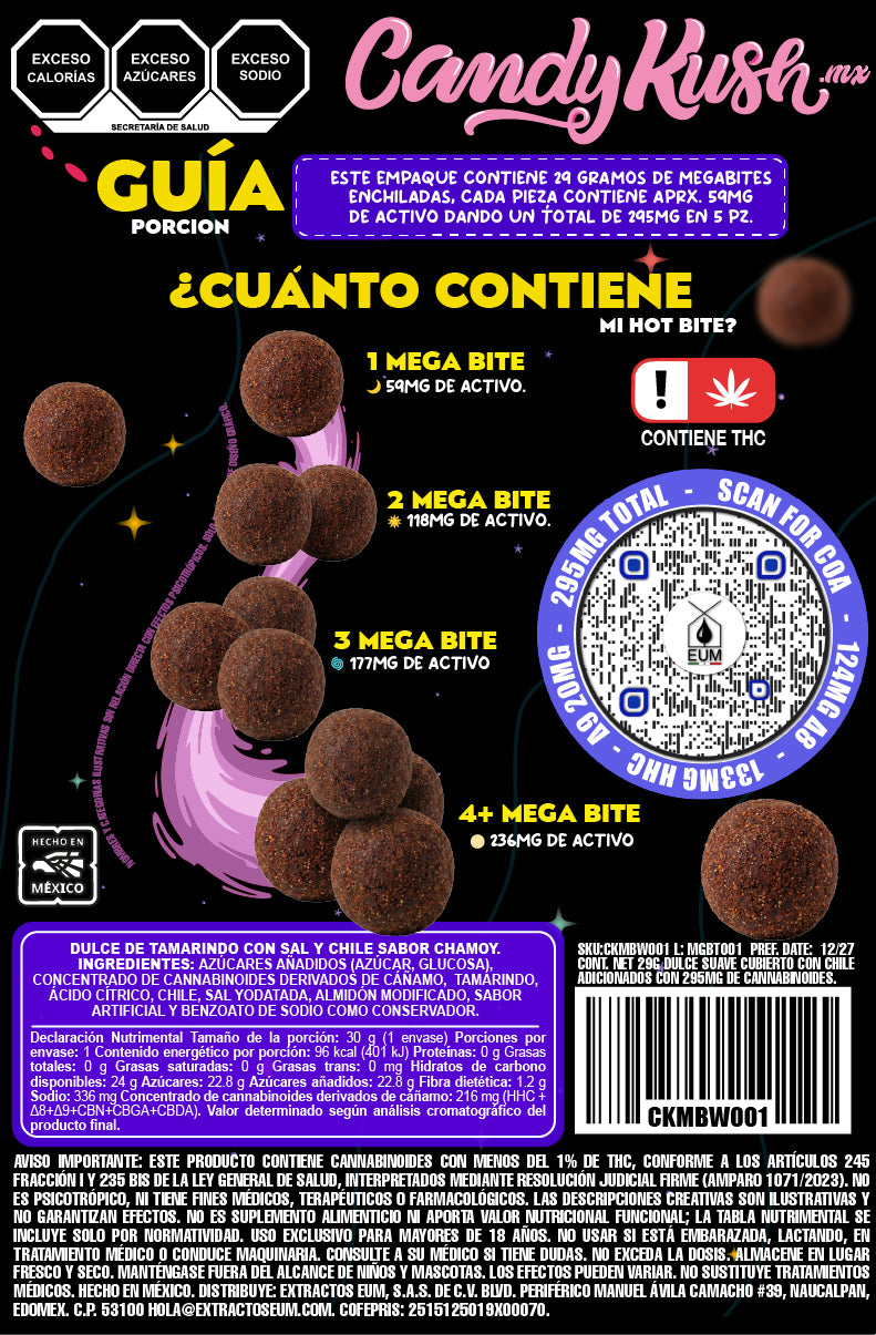 • Sabor atrevido: combinación única de dulce, ácido y enchilado que explota en cada bocado. • Pulpa natural: hechas con tamarindo real, enriquecidas con nuestra mezcla exclusiva de cannabinoides. • Formato práctico: 29g de bolitas enchiladas listas para compartir… o disfrutar solo. • Calidad garantizada: desarrolladas bajo el sello EXTRACTOS EUM™, con pureza y trazabilidad certificada.
